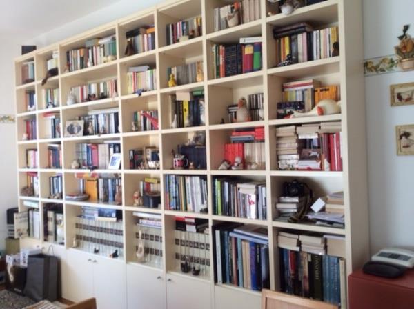 Libreria a parete composta da 4 moduli, completi di scaffalatura a cubi e mobile 2 ante inferiore per ogni mobile. Legno chiaro. Ogni modulo misura circa L. 60 cm, H. 200 cm.